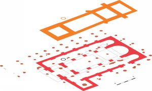 A 9. századi templom alaprajza faoszlopok helyével (lent)